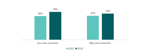 Figure 3: Percent of students reporting daily attendance is important, by socio-economic level 2022 and 2025.