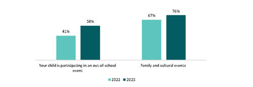 Figure 7: Percent of parents willing to let their child miss school for out-of-school events and family or cultural events, 2022 and 2025.