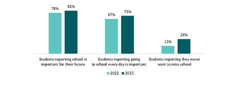 We found that attendance has improved and is now back at pre-Covid levels. Schools have put in place actions that have an impact. More students now think education is important for their future and daily attendance is important too.