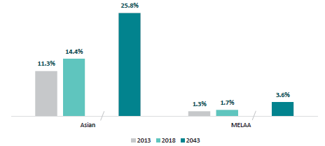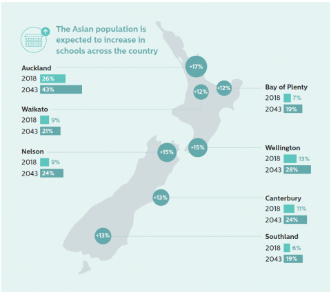 देश भर में विविधता बढ़ रही है, लेकिन यह सबसे तेजी से शहरी क्षेत्रों में बढ़ रही है। विद्यार्थी जातीय समुदायों की एक विस्तृत श्रृंखला से होंगे। यह उम्मीद की जाती है कि 2043 तक, चार में से एक (26 प्रतिशत) विद्यार्थी एशियन के रूप में पहचाना जायेगा और 20 में से एक (3.6 प्रतिशत) मध्य पूर्वी, लैटिन अमेरिकन या अफ्रीकी (MELAA - एमईएलएए) के रूप में पहचाना जायेगा। ऑकलैंड में पांच में से दो (43 प्रतिशत) से अधिक विद्यार्थी एशियन के रूप में पहचाने जायेंगे।