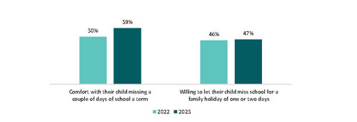 Figure 6: Percent of parents comfortable with their child missing a couple of days of school a term and willing to let their child miss school for a family holiday of one or two days, 2022 and 2025.