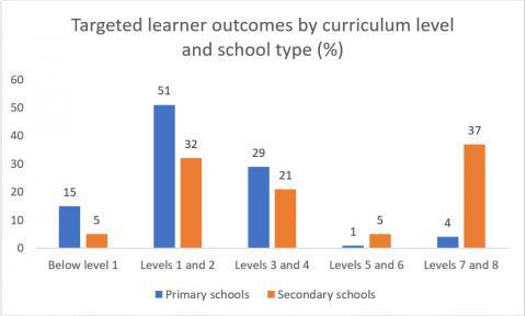 We asked leaders to identify where their goals for learner outcomes sat in relation to the curriculum levels for te reo MÄori. Unsurprisingly, there was a clear difference between primary and secondary schools in terms of their desired learner outcomes, with secondary schools much more likely to be targeting the higher levels of the curriculum. For the majority of primary schools, the targeted learner outcomes were at Level 2 or below. It is also worth noting that, even among secondary schools, nearly a third had targeted outcomes at Level 2 or below. This potentially limits learnersâ access to NCEA in te reo MÄori, with NCEA Level 1 corresponding to curriculum Level 5.